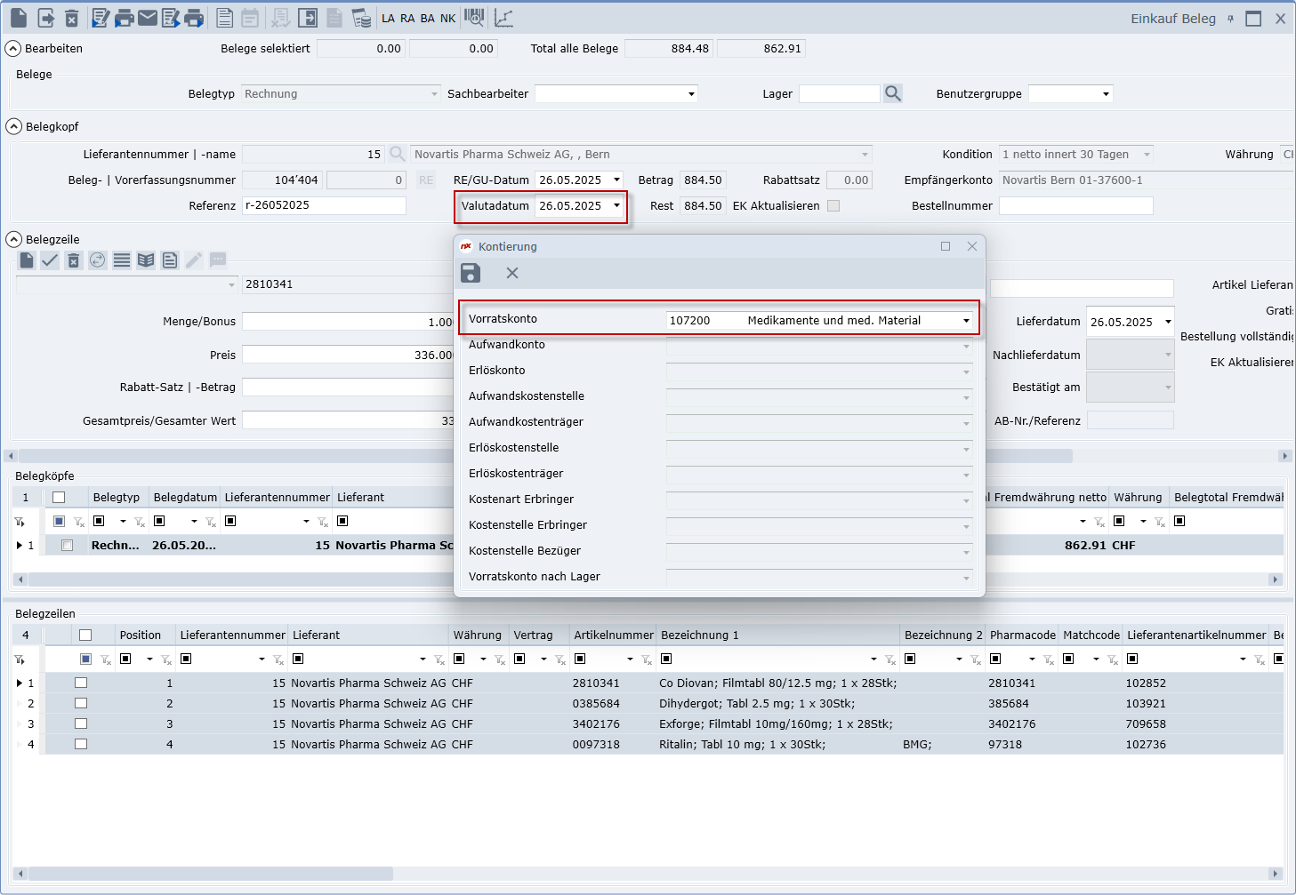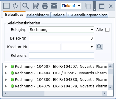 Nach der Verarbeitung wird die Ansicht automatisch aktualisiert und die Belege die mittels Checkbox deselektiert wurden oder nicht fehlerfrei sind, werden in der Maske wieder angezeigt. Um die Zeilen zu sehen, muss die Schaltfläche „Aktualisieren“ im unteren Bereich betätigt werden.- Charge / Verfall