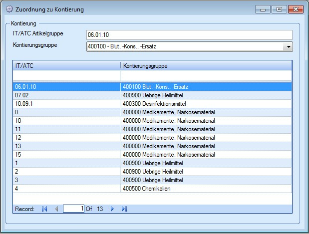 IT/ATC Artikelgruppe | Eingabe des IT oder ATC-Codes (Eingabe einer Teilkapitelnummer erlaubt, wenn diese komplett einer Kontierung zugeordnet werden kann ) |