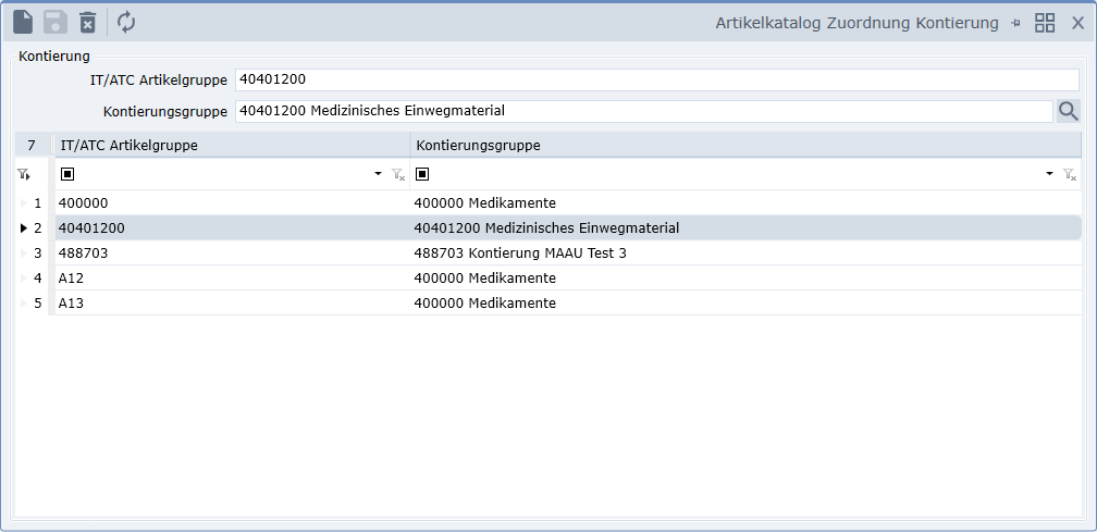 Hier können zu den Gruppen (IT bzw. ATC) Kontierungsgruppen zugeordnet werden, welche bei Neuanlage der Artikel als Kontierung auf dem Register Artikeldetail vorgeschlagen werden.