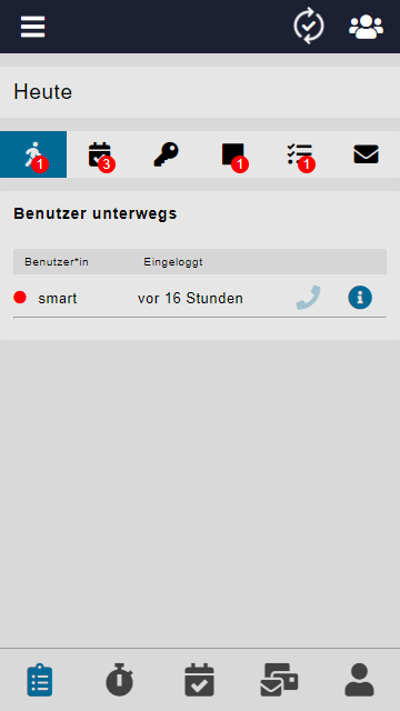Heute | Tagesübersicht mit jeweiliger Verlinkung zu: + Einsätze und Termine + Türschlüsselliste + Notizen + Fällige Aufgaben + Ungelesene Nachrichten |