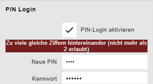 | Das Kästchen «PIN-Login aktivieren» kann angewählt werden. Anschliessend erscheint die PIN- und Kennworteingabe. |