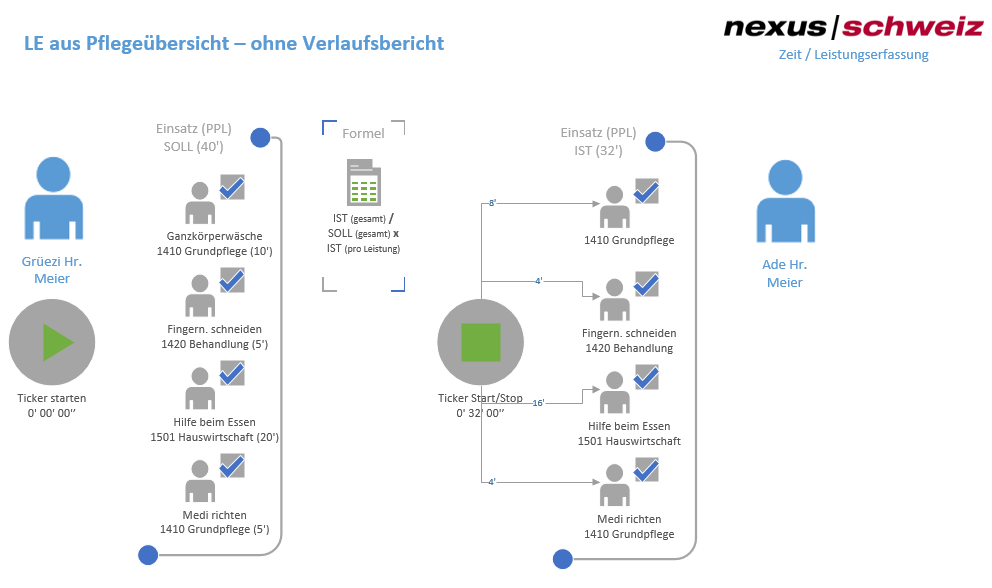 | Vorgegebene Zeit erfassen | Die vorgegebenen Zeiten jeder einzelnen Intervention wird direkt in die Pflegeübersicht übernommen, mit Verlaufsbericht, ohne Ticker. |