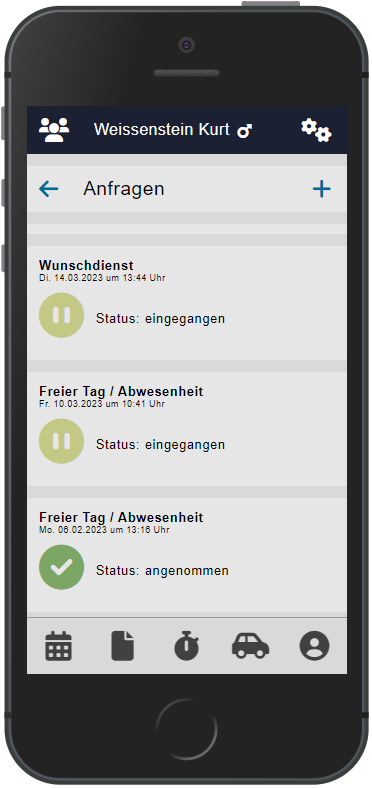 Die eingegangenen Anfragen müssten nun in der Desktop Version geöffnet und angeschaut werden. Je nach Antwort der leitenden Person erscheint der Wunschdienst als angenommen oder zurückgewiesen. Solange die Anfrage noch nicht beantwortet wurde, steht dies symbolisch als «Pause» in gelber Farbe in der mobilen App unter dem Register Anfragen.