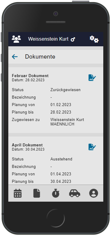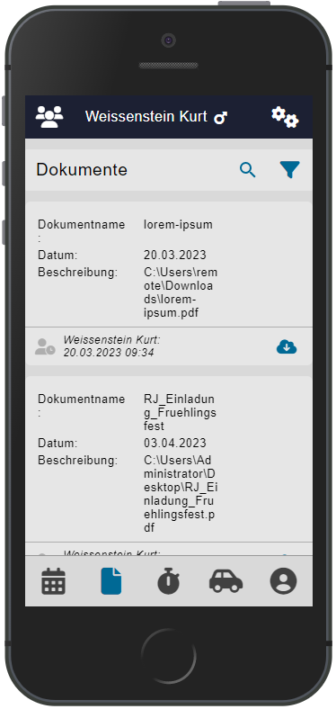 Vom Personal aus gibt es die Möglichkeit, Dokumente abzulegen. Diese Dokumente werden in der App listenartig dargestellt.