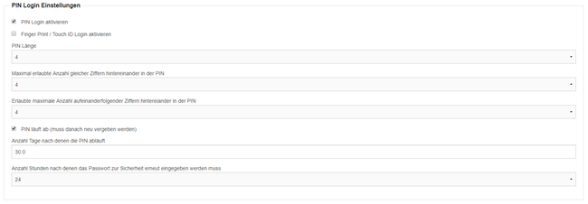 Ausserdem können verschiedene Einstellungen rund um die PIN Anforderungen gemacht werden.