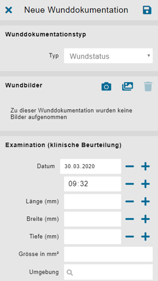 Bei der ersten Wunddokumentation handelt es sich immer um einen Wundstatus. Deshalb ist bei einer neu erstellen Wunde auch nur dieses Icon aktiv. Der Wundstatus ist die Erstbeurteilung. Dabei wird die Behandlung definiert. Der Wundstatus wird beispielsweise von einer Wundexpertin durchgeführt. Nach einer gewissen Zeit ist es möglich, eine Neubeurteilung zu machen und weitere Wundstatus anzulegen.