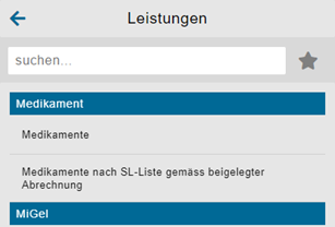 Sobald eine Leistung ausgewählt wurde, erscheint diese als Favorit. Der Leistungskatalog kann danach wieder geöffnet und einen weiteren Favorit hinzugefügt werden.