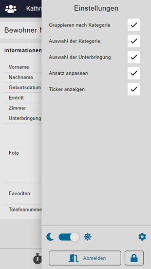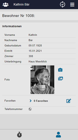 Nach der Bewohnerauswahl erscheint als erstes das Stammblatt des Bewohners. Dies beinhaltet die wichtigsten Informationen an einem Ort.