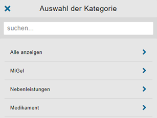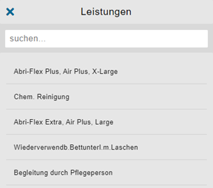 Unter Leistungen können die im Leistungskatalog hinterlegten Leistungen gesucht und ausgewählt werden.