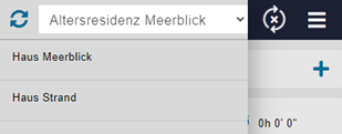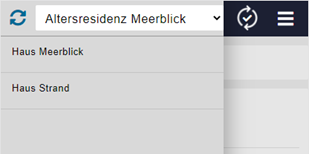 Als erstes sollte ein Bewohner ausgesucht werden. Die Bewohner können nach dem Alphabet oder nach der Ortschaft sortiert werden. Zusätzlich können die Heime vorgängig ausgewählt werden, sofern die Einstellungen aktiviert ist (siehe dazu Kapitel 2.6). Sofern die Einstellungen nicht vorhanden sind, gelangt man direkt zu der Bewohnerauswahl.