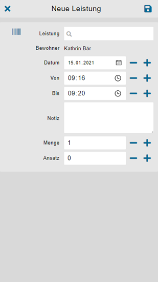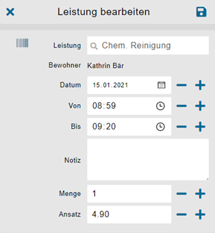 Die Eingabemaske kann benutzt werden, wenn eine Leistung ausversehen falsch erfasst wurde oder die Dauer nachträglich verlängert / verkürzt werden soll.
