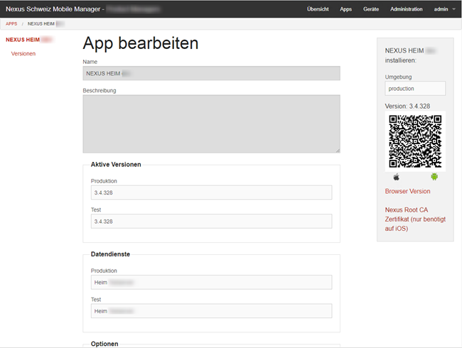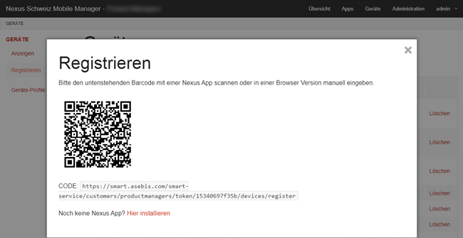 Für die Installation von NEXUS / HEIM mobile wird der Mobile Manager verwendet. Der Mobile Manager ist eine webbasierte Applikation, mit welcher die eingesetzten mobilen Geräte verwaltet werden können. Die mobile Applikation wird mittels QR Tag über den Mobile Manager heruntergeladen. Damit Sie den Mobile Manager nutzen können, benötigen Sie ein Login mit Passwort. Dies bekommen Sie in der Regel von der NEXUS Schweiz.