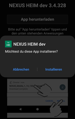 Die NEXUS / HEIM mobile App wurde erfolgreich installiert, wenn die App nach der Installation mittels Öffnen Knopf ausgeführt wird und die Registrierseite anzeigt. Die App lässt man geöffnet.