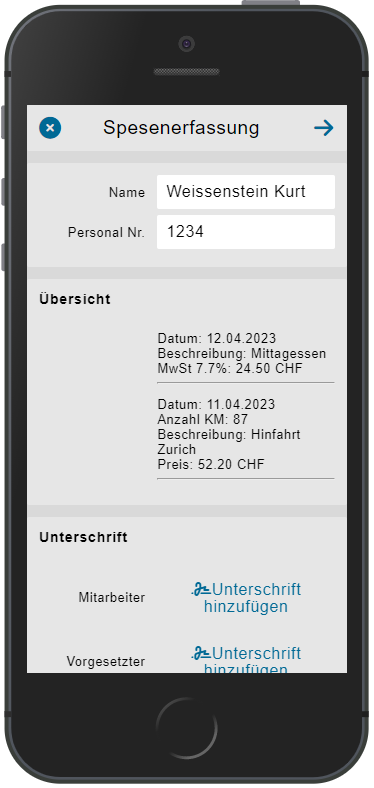 | Der Name und die Personalnummer werden automatisch abgefüllt, können aber bei Bedarf noch ergänzt oder angepasst werden. Die Übersicht zeigt die einzelnen Spesenpositionen separat gelistet noch einmal an. Die Unterschrift des Mitarbeiters kann hinzugefügt werden, die Unterschrift des Vorgesetzten hat momentan noch keine Funktion - wird aber für die zukünftige Entwicklungen verwendet.