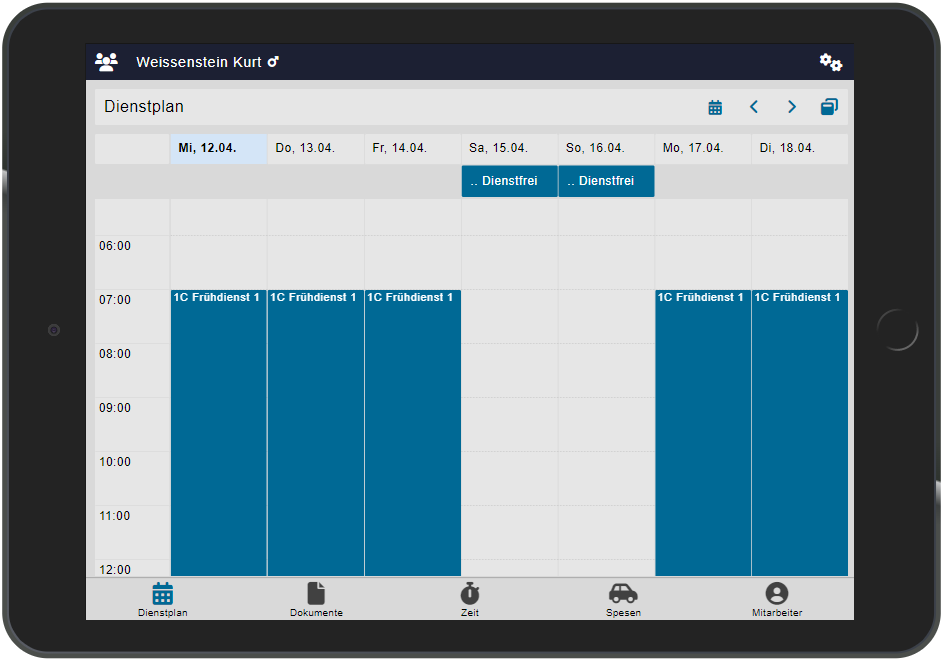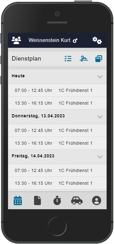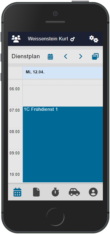 Auf der mobilen Applikation sind die Dienste nach einer Anmeldung oder einer Synchronisation mit der entsprechenden Antwort sichtbar. Der Dienst wurde durch die Anfrage im Peps automatisch eingeplant und ist an einem anderen Datum oder zu einer anderen Zeit im Dienstplan sichtbar.