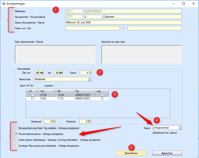 - Details vom Mitarbeiter, allfälliger Wunschdienst, Datum und Nachricht prüfen