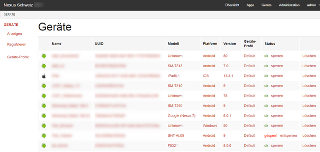 Falls ein Gerät gesperrt ist, wird dies in der Liste entsprechend angezeigt. Dies kann einfach durch Drücken auf «entsperren» geändert werden. Das Gerät läuft wieder normal.