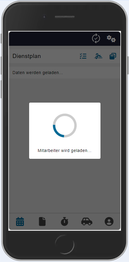 | Direkt nach der Anmeldung erscheint das Synchronisationsfenster. Sobald alle Daten geladen sind, verschwindet das Ladefenster und der Dienstplan ist (bei der Standardeinstellung) sichtbar. | ||||||||||||