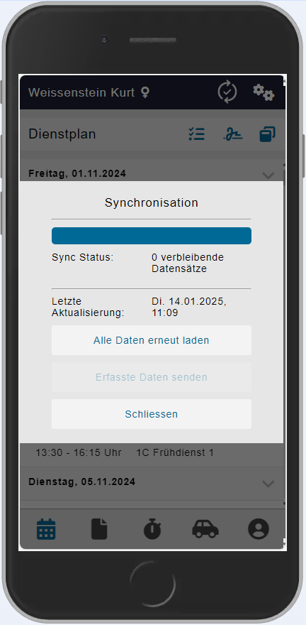 Falls die Dienste nicht sofort auf der App erscheinen, muss der Dienstplan noch gespeichert werden. Die Aktualisierungen werden dann an die App gesendet und die App kann manuell synchronisiert werden.