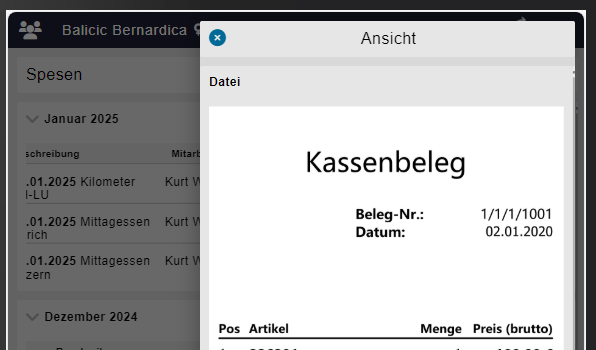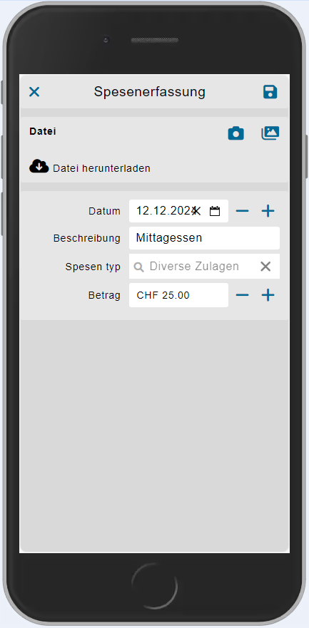 Zeigt die entsprechende Quittung, sobald das Age gedrückt wird. Das Datum sollte dem Datum der Quittung oder des Beleges entsprechen. Die Beschreibung kann frei gewählt werden, sollte im besten aber etwas mit der Spesenposition zu tun haben und kurz gehalten werden. Falls es Kilometerspesen sind, kann einfach die Anzahl Kilometer eingegeben werden - die App rechnet anschliessende automatisch. Falls der Kilometersatz nicht korrekt hinterlegt ist, kann dieser manuell noch angepasst werden. Der Spesentyp muss korrekt ausgelesen werden. Dieses Dropdown kann im Backend System (m Desktop) selbstständig mit den korrekten Lohnarten hinterlegen. Das Dropdown ändert sich dann automatisch bei der nächsten Anmeldung mit den neuen Lohnarten. Wichtig: