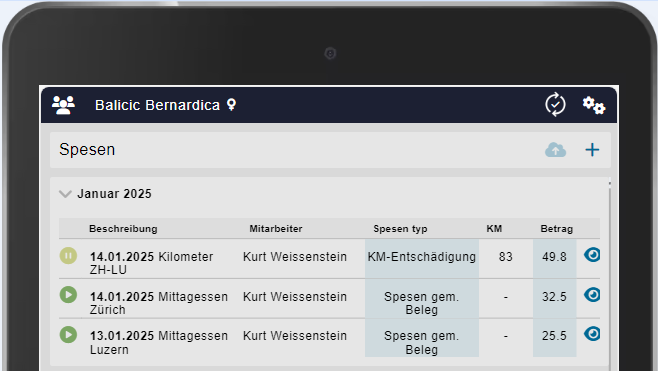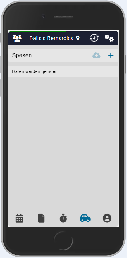 Das Wolkensymbol wurde nun, nach Erfassung der Spesenposition, aktiv. Mit einem Klick auf das Icon, wird die Spesenposition hochgeladen. Diese Funktion wurde extra so implementiert, dass sie mehrere Positionen erfassen können. Wichtig: