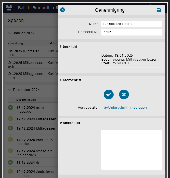 | Die Genehmigungsmaske wird automatisch abgefüllt mit dem Vorgesetzten und der dazugehörigen Personalnummer. Somit kann jederzeit nachvollzogen werden, wer die Genehmigung genau erteilt hat. Eine kurze Übersicht über die Spesenposition ist zu Kontrolle nochmals sichtbar.
