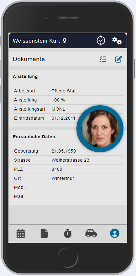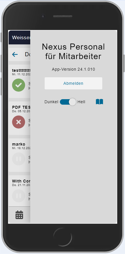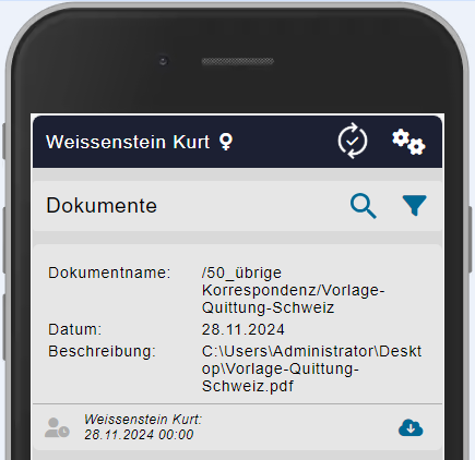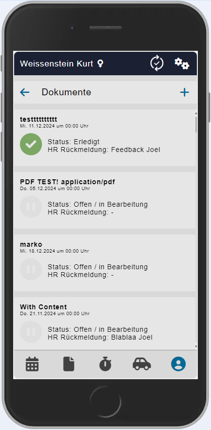 | Falls das Dokument durch das HR angenommen und im Personalstamm hochgeladen wurde, wird es bei einer freigegebenen Dokumetenablage wieder auf dem Mobilen Gerät angezeigt. Ein hochgeladenes, unbearbeitetes Dokument kann nicht mehr eingesehen werden - solange nicht, bis das HR das Dokument erledigt und korrekt abgelegt hat. | ||||||||||||