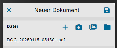 Das Dokument kann als Foto direkt gemacht werden, aus der Galerie oder aus dem Dateibrowser hinzugefügt werden. Zu einem Dokument gehört selbstverständlich ein Titel und ein Datum.