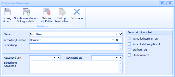 Im Assembly Ärzte zum Bewohner werden Ihnen die zuständigen Ärzte des Bewohners angezeigt.