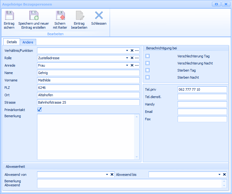 Bei Abwesenheit einer Bezugsperson kann der zeitliche Rahmen der Abwesenheit eingetragen werden. Auf dem Assembly Personalien und Tagesinformationen wird die Abwesenheit dieser Person angezeigt. Bei Erreichung des Rückkehrdatums werden die Informationen aus den oben genannten Assembly's wieder ausgeblendet.