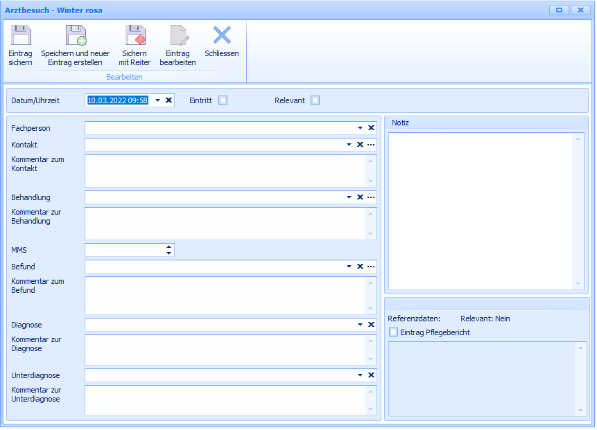 Hier kann ein Befund des Arztes erfasst werden. Das kann vielfältige Gründe haben: Neueintritt eines Bewohners, ein Praxisbesuch des Bewohners bei einem Arzt oder die Dokumentation einer Diagnose.