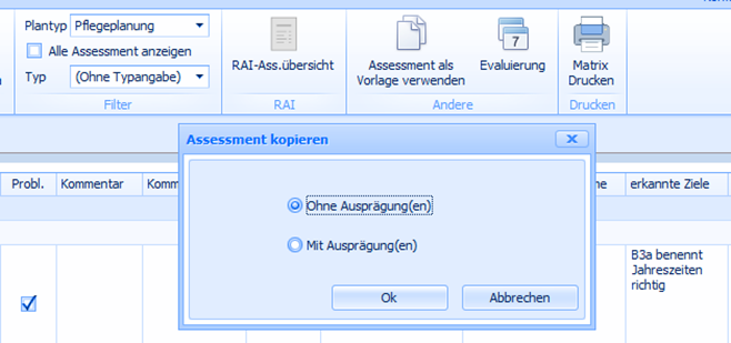 + Assessment als Vorlage verwenden (nicht für RAI-Assessment). Haben Sie ein Assessment abgeschlossen und archiviert, kann dieses Assessment mit dieser Funktion mit oder ohne Ausprägung dupliziert und anschliessend weiterbearbeitet werden.