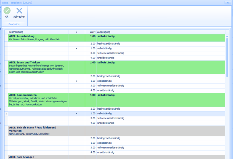 In der Spalte Ausprägung wird der Grad der Selbstständigkeit gewählt. Die Erläuterungen dazu, werden Ihnen angezeigt, wenn sie die … in der nächsten Spalte anwählen.