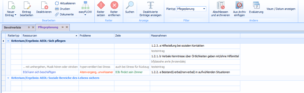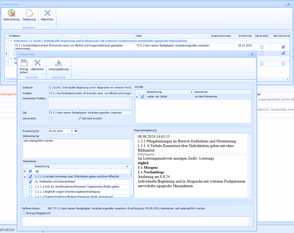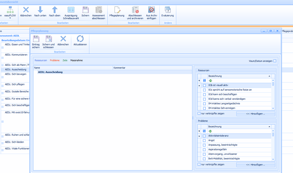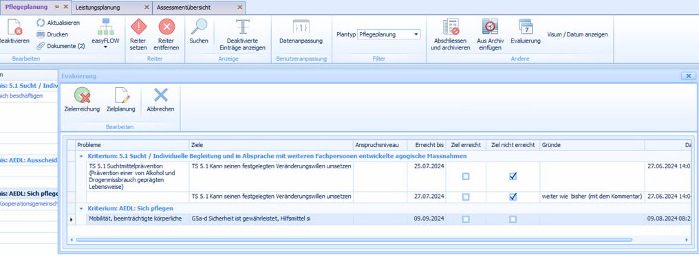 Die Evaluierung einer Pflegeplanung ist sowohl über das Assessment, wie auch direkt in der Pflegeplanung möglich.