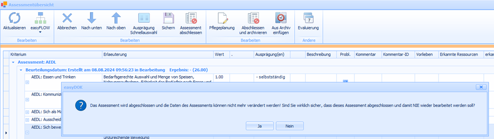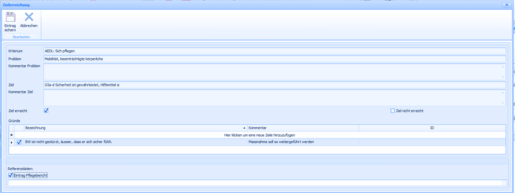 Nach Sichern wird das Kriterium in die Pflegeplanung übergeben.