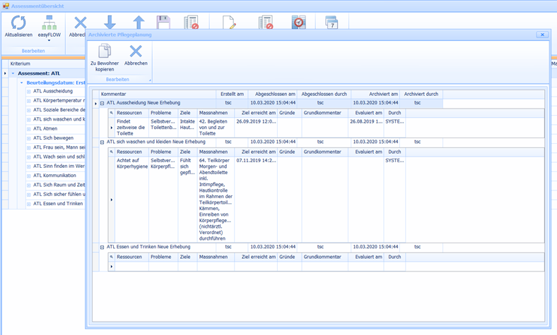 Archivierte Pflegeplanungen können zum Bewohner zurück kopiert werden. Hierzu muss das neue Assessment ausgefüllt sein und das Kriterium, auf welches sich die archivierte Pflegeplanung bezieht muss als Problematisch hinterlegt sein.