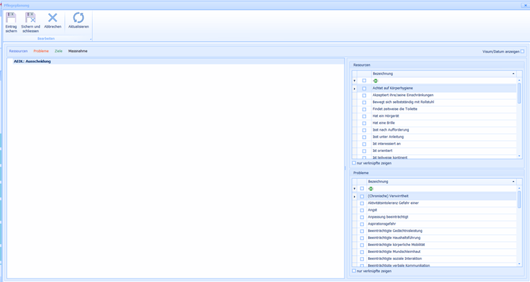 Die hinterlegten Ressourcen, Problemen und Ziele werden aus der Pflegeplanung übernommen.