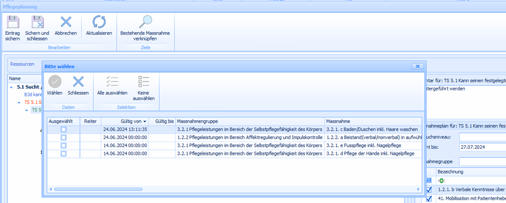 Wählen Sie dazu das Ziel an, in der Toolbar erscheint nun bestehende Massnahmen verknüpfen. Im neunen Fenster werden Ihnen jetzt alle bereits geplanten Massnahmen angezeigt, welche nicht mit einer aktuellen Pflegeplanung verknüpft sind, setzten Sie bei der gewünschten Massnahme einen Hacken in der Spalte Ausgewählt und sichern Sie den Eintrag mit Wählen.