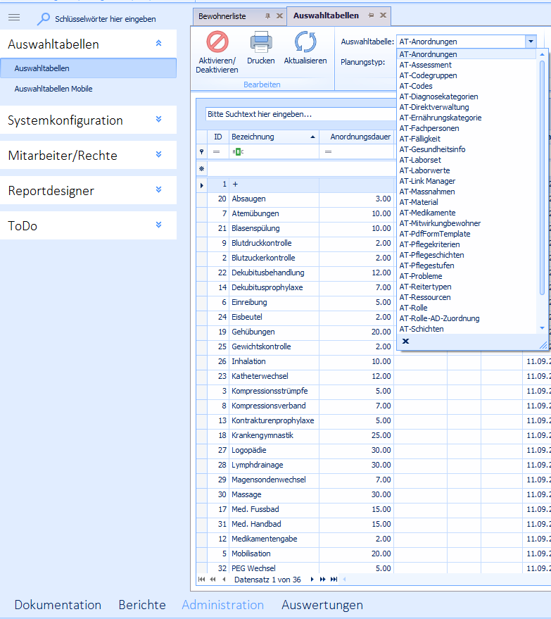 Die im Dokumentationsbereich hinterlegten Auswahltabellen in den jeweiligen Dropdown Menus, finden sie in der Administration. Die Auswahltabellen (AT) können hier bearbeitet werden.