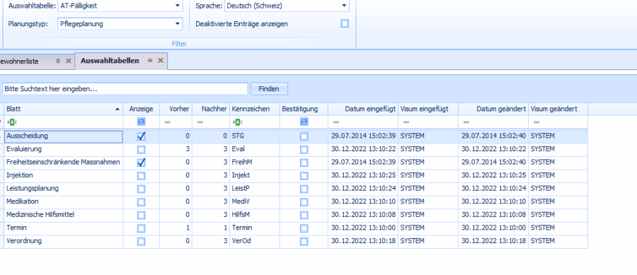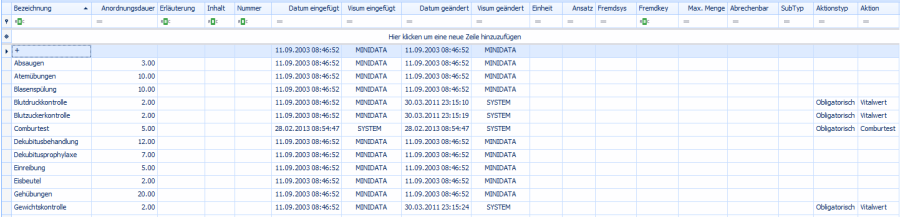 Hier sind alle Pflegemassnahmen in der Spalte Bezeichnung hinterlegt, die dazugehörige Massnahmengruppe wird in der nächsten Spalte angezeigt.