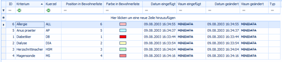 Hier haben sie die Möglichkeit, Gesundheitsinformationen, welche sie nicht mehr nutzen zu deaktivieren und neue Einträge zu machen. In der Spalte Position in Bewohnerliste, können sie die Reihenfolge der Gesundheitsinformationen bestimmen. Wählen sie nun noch eine Farbe aus.
