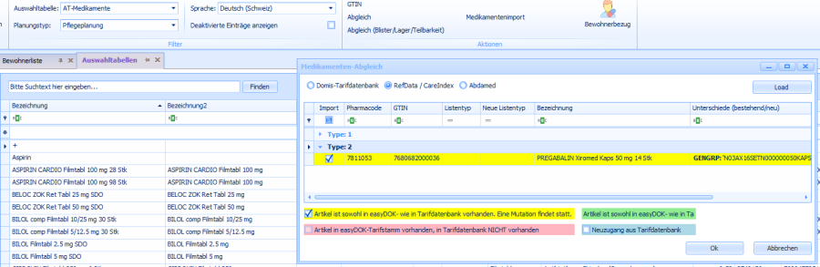 Dazu wählen sie in der Toolbar den Abgleich, wählen im neuen Fenster RefData/CareIndex und Load. Danach wählen sie alle Artikel bei denen eine Mutation stattfindet und bestätigen mit OK.
