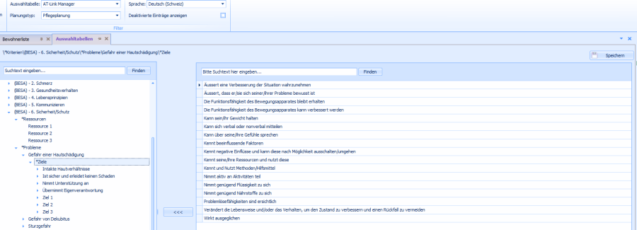 Dazu bearbeiten sie erst die AT-Kriterien, die AT-Ressourcen, die AT-Probleme und die AT-Ziele. Haben sie in diesen Auswahltabellen alles erfasst, was sie für die Pflegplanung benötigen, öffnen sie die AT-Link Manager.