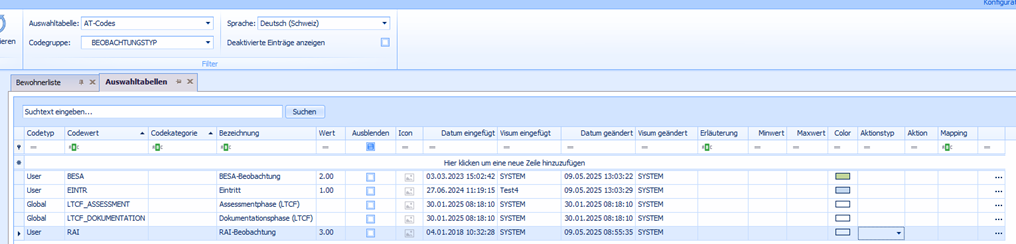 In der Auswahltabelle AT-Code BEOBACHTUNGSTYP, werden die bei Ihnen im System vorhandenen Beobachtungstypen angezeigt. Sie können nach Wunsch Einträge ergänzen oder Ändern und mit Farben erweitern.