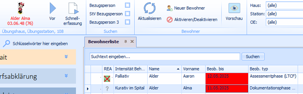 Ab dem ersten Tag der Beobachtung, wird in der Bewohnerliste in der Spalte Beob.bis das letzte Datum der Beobachtungsphase des aktuellen Beobachtungstyps angezeigt. Ausserdem wird die Spalte rot eingefärbt und der Name des Bewohners erscheint rot.