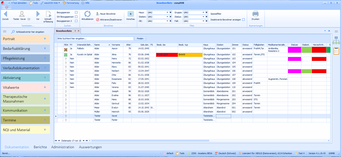 Nachdem Sie sich angemeldet haben, wechseln Sie zur Bewohnerliste. Hier finden Sie die wichtigsten Informationen zu ihren Bewohnern.