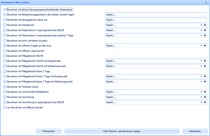 - Der Spezialfilter dient der weiteren Spezifikation der Bewohnerliste.