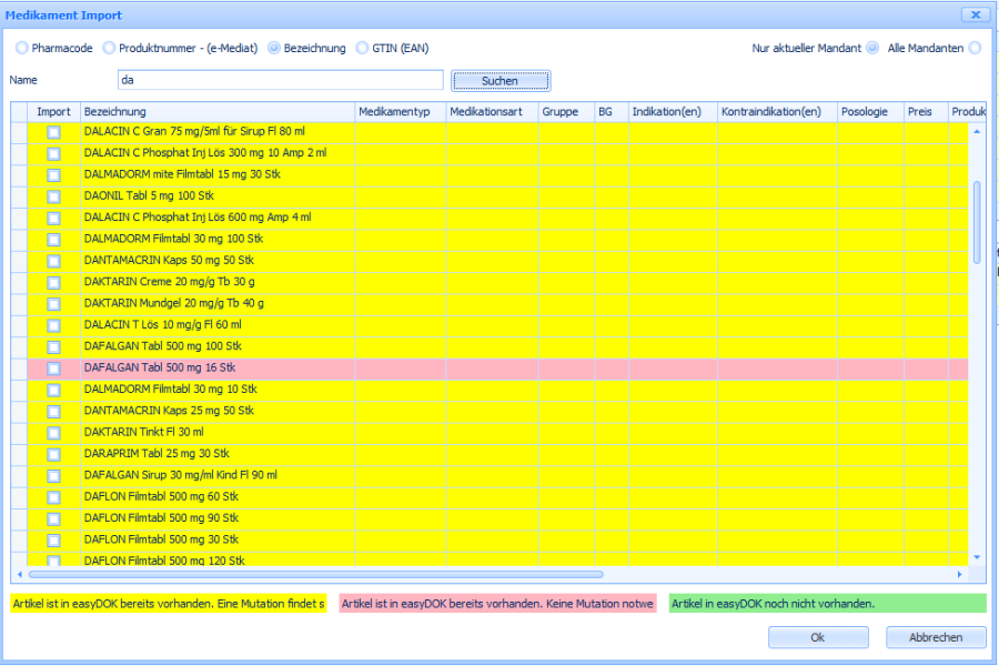 Wenn Sie hier ihr Medikament gefunden haben und es noch Grün ist, setzen Sie ein Häkchen und drücken anschliessend auf OK. Falls es schon Gelb oder Rot ist müssen Sie es nicht nochmal importieren. Anschliessend können Sie den Import schliessen und das Medikament gleich nützen.