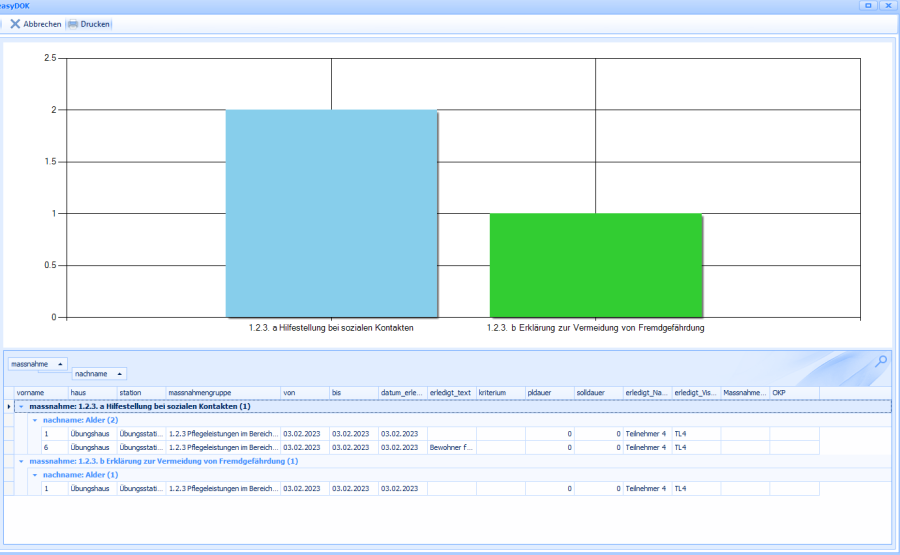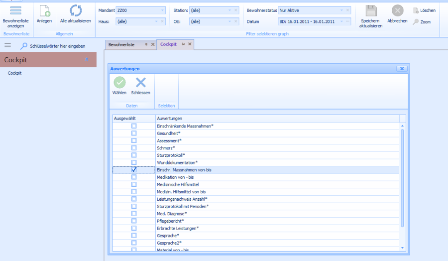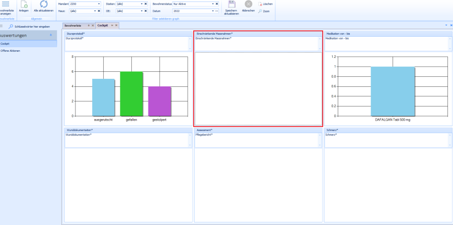 Im Auswertungstool Cockpit, können verschiedene Dokumentationsebenen, diverse Auswertungen angezeigt werden.