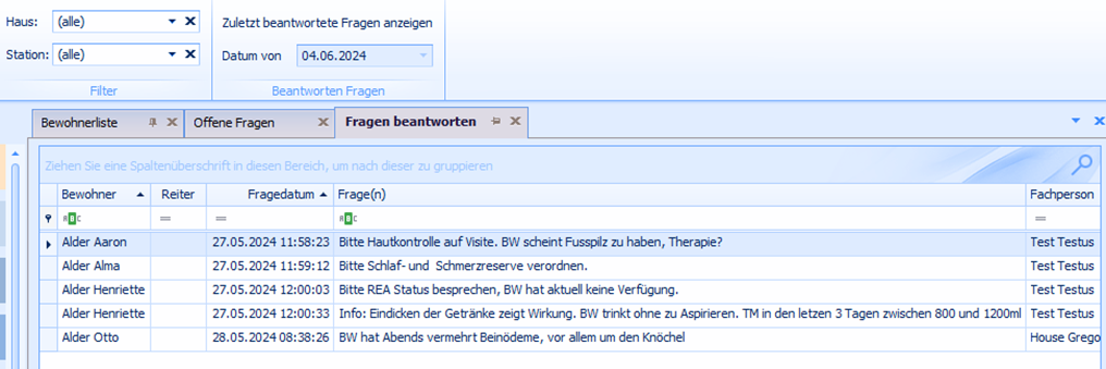 Im Modul Fragen beantworten werden alle noch offenen Fragen aller Bewohner angezeigt und stehen in zentral zur Beantwortung bereit. Markieren Sie die zu Beantwortende Frage und klicken in der Toolbar auf den Button Beantworten.